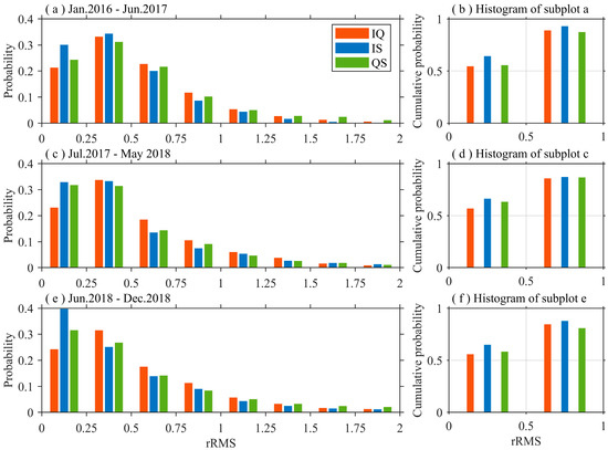 Probability distributions of Figure 4. Subplots (a,c,e) display the probabilities of rRMS values of IGG relative to QF (IQ), IGG relative to SSA (IS), and QF relative to SSA (QS), respectively, during three periods: January 2016 to June 2017, July 2017 to May 2018, June 2018 to December 2018. Subplots (b,d,f) display the cumulative probabilities of (a,c,e), respectively.