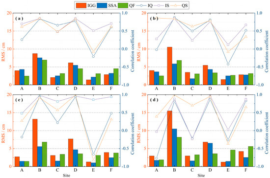 Comparison of correlations and RMS values at six sites with large differences in their rRMS values (see Figure 6 for locations). The analysis was performed over four time periods: (a) January 2003 to December 2018; (b) January 2016 to June 2017; (c) July 2017 to May 2018; (d) June 2018 to December 2018. IQ, IS, and QS represent the correlations between IGG and QF, IGG and SSA, and QF and SSA time series, respectively. The bars and series represent the RMS values and correlation coefficients, respectively.