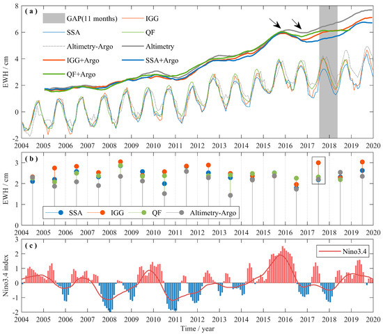 Next, we scrutinized the discrepancies after 2016. The interannual variations were obtained by averaging the series over a sliding 12-month window (Figure 8a) and they were shifted upwards by 2 cm for better visualization. Figure 8a shows that all the IGG + Argo, SSA + Argo, and IGG + Argo series fit well with the altimetry series before August 2016. However, the four series exhibited substantial discrepancies after 2016, with lower values for SSA + Argo, IGG + Argo, and QF + Argo than the altimetric results. There are several possible causes: (a) Deteriorated data quality during the late stages of GRACE satellites operations and the reduced number of accelerometers after 2015 [51,52]; (b) inaccuracies of Argo data [53]; and (c) uncertainties in the estimated degree-1 series [51]. Although these large discrepancies prevent a quality evaluation based on the sea level budget approach, the IGG + Argo and QF + Argo series consistently show closer agreement with Altimetry than SSA + Argo during the gap period, indicating that SSA may underestimate the mean seawater mass variation in the gap months. However, it is important to note that the IGG series suspiciously shows a strong seasonal increase in 2017 (marked by the box in Figure 8b) when the ENSO index is weak (Figure 8c). According to previous records, strong seasonal changes always occur when the ENSO index is extremely negative (e.g., in 2008, 2011, and 2012).