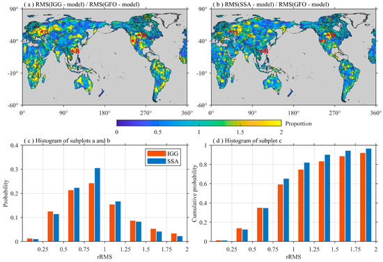 Comparison of the RMS values of residuals of (a) IGG and (b) SSA by subtracting GRACE-REC. (c) Probability and (d) cumulative distribution of grid values in (a,b).