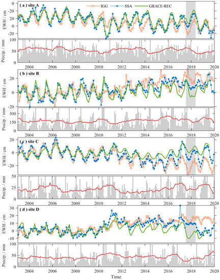 Figure 10 shows the time series of EWH and precipitation at points A, B, C, and D (marked in Figure 9), where the relative RMS values are large, to illustrate the potential bias in IGG and SSA. The precipitation data are the monthly average reanalysis data, expressed as EWH, obtained from the Climate Data Store (https://cds.climate.copernicus.eu/#!/home, Brussels, Belgium, April 2022). The water storage in point A shows a 2010 drought and a post-2016 increase, which are consistent with the progression of dry and wet periods. The alternation of positive and negative water storage anomalies is well-reflected by the SSA and GRACE-REC results, but not in the IGG results. This case demonstrates that using the first six modes in IGG may lose some interannual variation in regional signals. This problem can also be found at point C, where the IGG result fails to capture the water storage after 2016 due to the contemporaneous increase in precipitation. The time series of IGG and SSA at points B, C, and D are fairly consistent until 2017, after which their differences start to increase. The main reason for this discrepancy may be that the IGG only used GRACE data from February 2002 to August 2016, but the extrapolated gravity fields from the SLR could not maintain the previous variation pattern and may not accurately reflect some sudden mass change signals as GRACE does. The series of SSA and GRACE-REC were mostly consistent, especially before and after the gap period. However, the SSA data have one big shortcoming. As it is totally data-driven, it cannot capture a suddenly emergent climatic event during the data gap. For instance, point D located in North America was influenced by a sudden precipitation deficit in 2016, resulting in GRACE-REC results showing a sharp decrease in water storage. However, SSA reflects only a moderate decrease in water storage in 2016. Nevertheless, such interannual variability is absent in the IGG result as well.