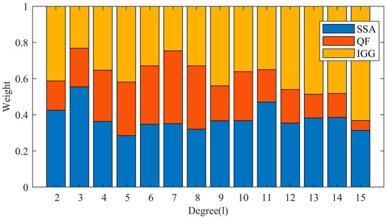 Here, we put forward a new strategy based on the triple-collocation method to generate a fused SHC gap filling product, which theoretically avoids random error better than any of the individual datasets. We first estimated the error variance of each degree and order based on the 10-year SHCs data from 2009 to 2018 and counted the median variance of each order. Note that the calculated error variance may occasionally be negative (less than 25%) due to increased correlation among the series, which will affect the calculation of weights. Therefore, to get rid of these negative values, we use the median error variance of each degree (l) to calculate the weight, which is used for all coefficients of the same degree (i.e., we assume the data quality is a function of only degree). Regarding the finite spatial resolution of the QF, only the low-degree terms (degree 2–15) were fused. Figure 11 shows the distribution of weight values for each degree of SHCs. Compared to IGG and SSA, the weights of QF are lower and gradually decline with an increasing degree. This result is consistent with our previous finding that the higher degree terms of the SHCs of QF may contain higher errors and should therefore be given smaller weights when performing the data fusion.