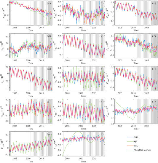 Next, the weights calculated in Figure 11 were applied to fuse the SHCs of SSA, QF, and IGG. We only show the results of coefficients of order = 1 in Figure 12. The weighted average results retain the interannual signal to a large extent and provide better agreement with the IGG and SSA series and effectively avoid the detrimental effects of systematic bias in QF, such as C2,1, C5,1, C13,1, and C15,1. The fused series shows a large difference when the individual series are subject to high-frequency vibrations, such as C5,1, C7,1, C13,1, and C15,1, and the weighted average is evidently smoother, indicating the noise is suppressed to a certain extent. In some cases, the fused series can better maintain the seasonal and interannual variation patterns in the gap months. For example, the agreement for the results of C7,1 is poor: IGG and QF appear to over- or underestimate the value of the gap period, and SSA, while retaining the long-term trend, loses much of the seasonality (Figure 12f). Nevertheless, the fused series retains both the long-term trend and part of the seasonal signal.