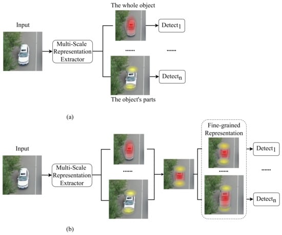 The difficulty of UAV object detection lies in building robust features to distinguish foreground targets with limited pixels from background clutter [,,]. Existing methods can be roughly grouped into three major streams, i.e., super-resolution-based (SR-based) methods, context-based methods and multi-scale representation-based (MR-based) methods.