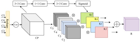 MR-based UAV object detection methods [,,,,] use a strategy of combining the rich semantic information in high-level features for target classification and the detailed spatial information in low-level features for determining targets’ positions. PANet [] proposed adding a bottom–up path to supply the object spatial information in low-level features to the high-level features, which shortens the information path between the lower-layer and topmost-layer features. A Balanced Feature Pyramid [] was proposed, which consisted of four stages, i.e., rescaling, integrating, refining and strengthening. The same deeply integrated balanced semantic features were used to enhance the multi-scale features. NAS [] provided a new exploration direction for vision tasks. NAS-FPN [] and Bi-FPN [] utilized neural architecture searches to search Feature Pyramid Networks (FPN) and Path Aggregation Feature Pyramid Networks, respectively, for a better cross-scale feature network topology. However, the search processes required a huge amount of GPU resources and computation time.