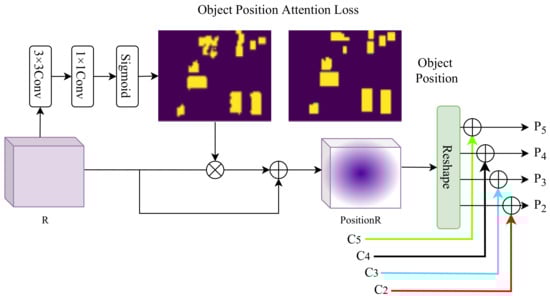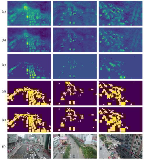 For supervised training, the cross-entropy loss between the one-channel feature map and the binary mask is utilized to compute the object position attention loss. Due to the lack of mask annotation for high-precision object positions in UAV images, we assign the value of 1 to all the pixels inside the ground-truth bounding box and 0 for all other pixels to obtain the object position mask, as shown in Figure 5. Regardless of annotations for objects’ categories, all the value of the pixels inside the ground-truth bounding boxes in an image have the value of 1 to highlight the foreground regions.