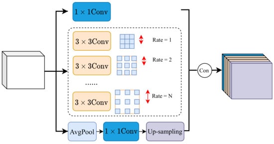 Our proposed Global–Local Context Collector, denoted as GLCC, consists of three components, i.e., a global average pooling layer followed by a  convolutional layer, several dilated convolutions with different  kernels and atrous rates and a  convolutional layer. The global average pooling layer is used to collect the global context information, and several dilated convolutions are used to collect the local context information. Figure 6 illustrates the details of GLCC. In the top branch, a  convolutional layer  is used to embed the input feature . In the bottom branch, a global average pooling layer  is adopted to collect the global contextual information at the image level. In the middle branch, several  convolution filters  with the atrous rate  are utilized to encode local context information. Finally, these features extracted through the above three branches are concatenated together. In particular, we formulate this procedure as follows: