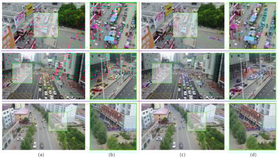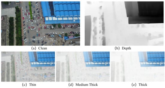 (2) VisDrone_Foggy: Our synthetic VisDrone_Foggy dataset is built upon the VisDrone2019 benchmark dataset. According to the atmospheric scattering model [], we transform images in the VisDrone2019 dataset to foggy images for our VisDrone_Foggy. We generate images with thin, medium thick, and thick fog by setting different parameters of the atmospheric scattering model, as shown in Figure 7. Our VisDrone_Foggy adopts the same annotations in the original VisDrone2019.