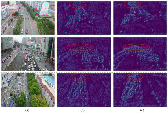 (6) Effect of the low-level representation: We also conducted experiments to verify the effectiveness of low-level feature maps for UAV object detection. Table 3 shows that the tinyHead modification has boosted the performance by 3.7%. The tinyHead represents the baseline model with a lower-level representation extracted from the Backbone module. Figure 11 shows the comparison between the heatmaps of the last and second last layers. The red areas in the right column are darker and smaller than those in the middle column. The results show that the feature maps in the right column focus more accurately on the object spatial locations, indicating that our tinyHead can help make the network focus more precisely on objects. This is because the lower-level features are generated by the convolutional filter with a smaller kernel size, which is beneficial for extracting small objects’ features.