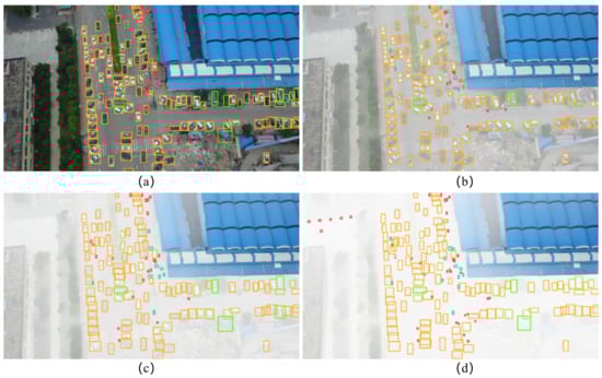 (5) Visual Comparison of the Detection Results: We also visually compare the detection results obtained with and without the proposed components in Figure 10. Comparing Figure 10b with Figure 10d, it can be seen that smaller objects can be well detected by our method. This is because our method converts the position-semantic inconsistency issue into one that makes the RoIs’ (located by tiny objects) multi-scale feature simultaneously contain detailed spatial information and strong semantic information.