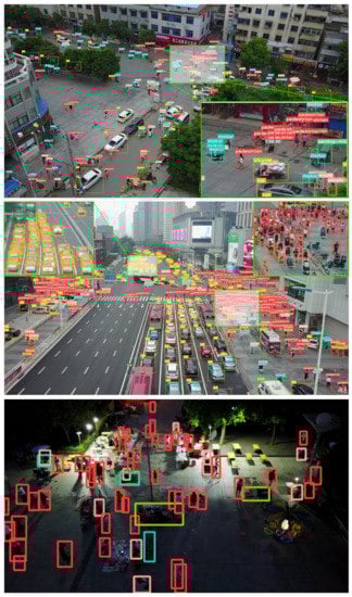 Unmanned Aerial Vehicles (UAVs) equipped with cameras have received a lot of attention in recent years [,,]. UAVs can be deployed rapidly with a wide range of new applications, including aerial photography and video surveillance, at a relatively low cost. Therefore, automatic understanding of visual data captured by UAVs is highly demanding, bringing computer vision and UAVs together more and more closely. In the field of computer vision, significant progress has been achieved in object detection. Existing detectors such as the YOLO family [,] and Faster RCNN [] can achieve satisfying performance on natural images. The targets to be recognized in natural scenes generally consist of a large number of pixels. These detectors usually demand a huge amount of computing resources to ensure their capability and performance. However, the existing detectors perform poorly in situ because UAV images contain quite small objects with very limited numbers of pixels, and the UAVs’ airborne computational resources are very limited [,,].