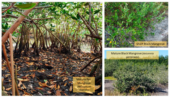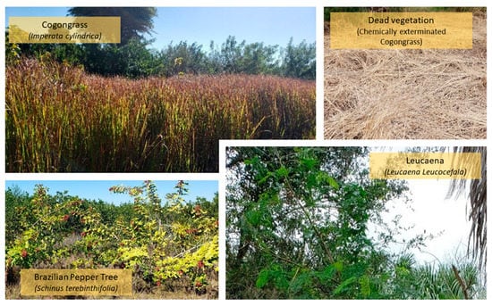 This study was conducted on an eight-acre, tidally influenced stretch in the Wolf Branch Creek Coastal Nature Preserve, located in West Florida approximately at latitude: 27°44′40.9′′N and longitude: 82°26′34.5′′W, Figure 2. The preserve comprises different types of coastal land cover types, such as upland cabbage palm hammocks, wet and dry grasslands, mangals, and pine flatwoods, where many of those habitats have already been artificially restored. The study area is also affected by the non-native invasive species Brazilian Peppertree (Schinus terebinthifolia), leucaena (Leucaena leucocephala), and cogongrass (Imperata cylindrica), being the last species listed among the top 10 most pervasive exotic invasive plants in the world [61]. The preserve periodically goes through management campaigns to control invasive plant infestations. There are mangrove species, Figure 3, and native grass species, Figure 4, in the study area. Healthy and treated cogongrass is present at the site, Figure 5. A land cover classification schema involving 17 coastal land cover types, Table 1, was adopted. The classes include seven grass species (six natives and one invasive), Cabbage Palmetto (Sabal Palmetto), two mangrove species (Avicennia germinans and Rhizophora mangle), black mangrove (Avicennia germinans), two invasive brush tree species (Brazilian Peppertree (Schinus terebinthifolia), leucaena (Leucaena leucocephala)), water, dead vegetation, and two exposed soil classes, Table 1. The reserve site is actively managed to control and eradicate invasive plants (Brazilian Peppertree sprouts, leucaena, and cogongrass), so we also have a dead vegetation class.