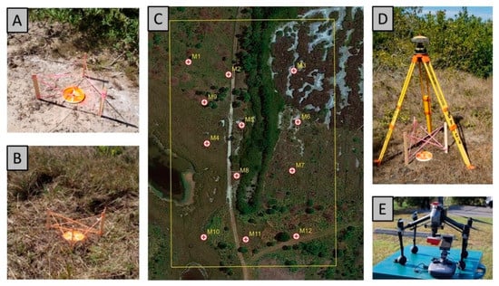 Ground Control Point Establishment: In preparation for the UAS data acquisition missions, a set of twelve ground control points (GCP) were established in the study area, Figure 6. The points were surveyed using survey-grade Topcon HiperLite Plus Global Navigation Satellite System (GNSS) receivers with a reported accuracy for a static survey of 3 mm + 0.5 ppm horizontal and 5 mm + 0.5 ppm vertical [63]. A set of three receivers capable of processing signals from the GPS and GLONASS constellations with multipath mitigation were used to occupy each GCP for at least 2 h, collecting measurements every 5 s, Figure 6. The collected GNSS observations were processed using the National Oceanic and Atmospheric Administration’s (NOAA) Online Positioning User Service Projects (OPUS Projects) (https://www.ngs.noaa.gov/OPUS-Projects/OpusProjects.shtml), (accessed on 8 July 2022) to produce control point coordinates with an uncertainty below the centimeter level.