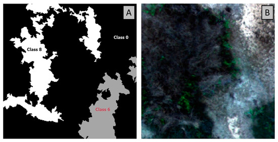Training tiles (A) mask showing the three classes identified and labeled in (B) the sample image tile. Class 0 represents the background.