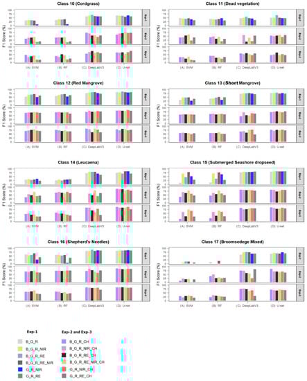 In general, the use of the red edge and near-infrared bands in the three experiments yielded slightly higher accuracies in mapping the Brazilian pepper class (class 1), Cabbage palmetto class (class 2), black mangrove class (class 4), organic brown soil class (6), black needle rush class (class 8), cordgrass class (class 10), red mangrove class (class 12), short mangrove class (13), and submerged seashore dropseed (class 15), which could be an argument to consider these bands when those particular land cover types are of interest and need to be mapped using the RF or SVM classifiers Figure 13 and Figure 14, (for more detail see Appendix A). We observed levels of class mixing among classes with similar spectral characteristics in the visible spectrum. For example, the RF and SVM classifiers show the broomsedge class (class 17) was frequently confused with the cogongrass class (class 7), seashore dropseed class (class 9), cordgrass class (class 10), dead vegetation class (class 11), and the Shepherd’s needles class (class 16) (Appendix B). The misclassification is so severe that the user and producer accuracies (Appendix A.1) of these classes in most cases were very low when the RF and SVM classifiers were used. This inability to isolate class 17 did not replicate itself in the deep learning classifications, where U-net was able to map class 17 with an F1 score of around 70%, Figure 14.