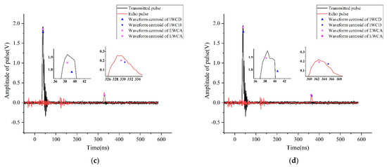 The calculated centroid points of the transmitted and the echo pulses: (a) measure the target distance at 25 m (b) measure the target distance at 30 m (c) measure the target distance at 35 m (d) measure the target distance at 40 m.