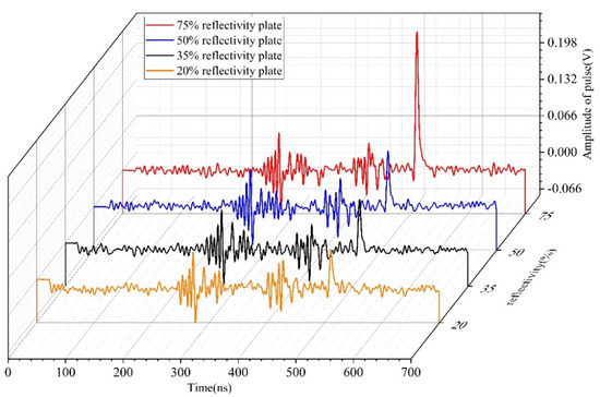 The BOSCH GLM500 laser (BOSCH, Gerlingen, Germany) rangefinder is used to calibrate the standard distance, and its ranging accuracy is mm, which is used to calibrate the target position at the distance of 25 m, 30 m, 35 m, and 40 m. Through repeating 50 experiments for each position, the data sampled by the oscilloscope are recorded, and the relevant data are processed offline on the computer. The calculated pulse centroid is shown in Figure 6, where the actual sampling of the avalanche APD is negative. In order to show an intuitive comparison, we perform a positive-negative conversion on the sampling pulse. The recorded results of the experiment are shown in Table 3.