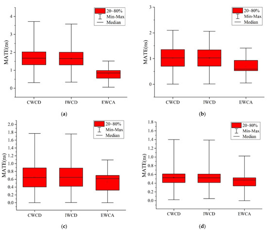 As shown in Table 1, the CWCA algorithm significantly differs in error and stability compared with the IWCD and EWCA. Therefore, the error comparison of the latter two algorithms is mainly made, and the error distribution diagram of the IWCD and EWCA algorithms is made, as shown in Figure 3.