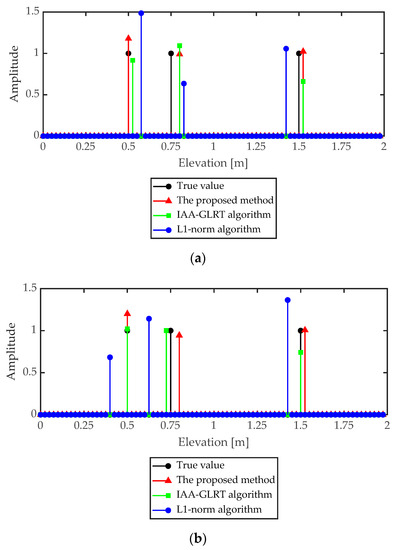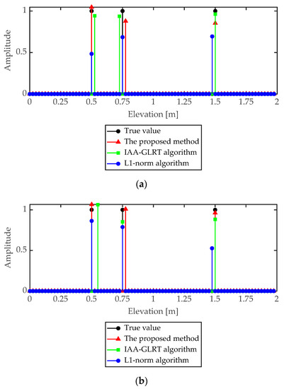 In order to illustrate the effectiveness of the proposed method, the point target simulation data was used to analyze the reconstruction error. In the simulation data, there were three scattering points with different elevations in the pixel unit. The radar collected data at eight different elevation angles, and each sub-aperture had eight baselines. In point target simulation, three adjacent sub-apertures were used to form group vectors, and the system parameters are shown in Table 1. According to the baseline data, the Rayleigh resolution in elevation was 0.52 m.