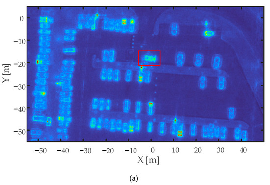 The 2D incoherent imaging results in Figure 8 show that there were a large number of civilian vehicles in the observed area of the parking lot. In the single pass circular incoherent imaging results of the vehicle target, there were two contours, the inner contour was the bottom of the vehicle and the outer contour was the top of the vehicle. Due to the selection of BP imaging plane, the bottom of the vehicle was focused and the top of the vehicle was defocused on the ground plane.