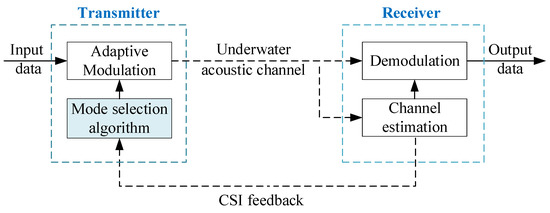 Figure 1 illustrates the general AM model for a UWA communication system. The transmitter adaptively changes its modulation mode according to the CSI that is fed back by the receiver. First, the transmitter sends signals to the receiver. Then, on the receiver side, the channel estimation module extracts the envelope and phase information from the signals to estimate the CSI. The estimated CSI is also used in the demodulation module to output data. Then, the receiver feeds back the estimated CSI and demodulation results to the transmitter. Finally, on the transmitter side, the modulation mode selection module determines the appropriate modulation mode and the transmitter performs adaptive modulation to send out data.