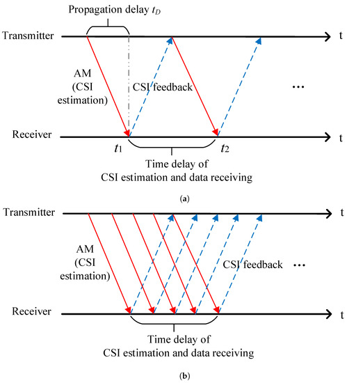 The propagation delays in the UWA adaptive modulation process: (a) the propagation delays in classical UWA AM [12,27]; (b) the propagation delays in UWA AM with continuous transmissions [28].