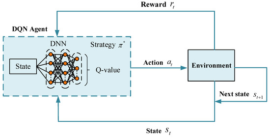 where is the DNN parameter vectors. At time slot t, the state was taken as a DNN input and the Q-values were the output for each action. There was a total of M outputs for the different actions. Different from Formula (6), the DQN agent updated by training to update the Q-values by calculating the value of the Q-table. After convergence, the agent could obtain the Q-values by inputting the states into the DQN.