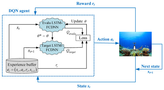 where and are the weight matrices and is the output of the current layer at the previous time slot. It can be seen that the output was not only related to the input of the current time but also to the output of the previous time. The LSTM-enhanced DQN enabled the transmitter to effectively remember the previous states and extract the internal correlations, thereby enhancing the mapping effectiveness for the action-state pairs and rewards. For the UWA AM, it could finally achieve better action selection results by effectively learning from the partial available UWA CSI.