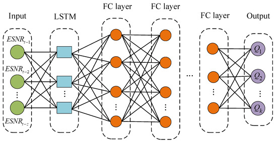 As shown in Figure 5, the DNN structure in LSTM-DQN-AM was improved by adding an LSTM layer before the first layer of the fully connected (FC) deep neural network. The state that consisted of the time series ESNR values was input into the LSTM of the DNN. After training, the Q-values that corresponded to the different actions were output.