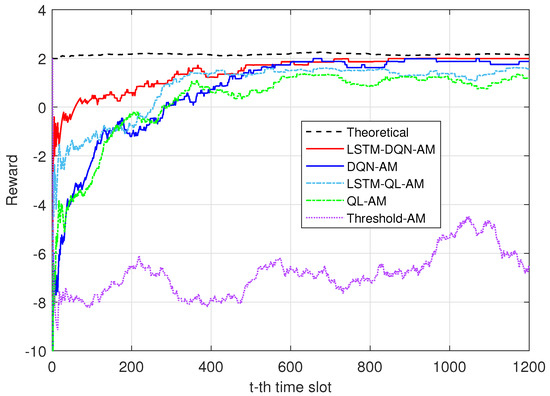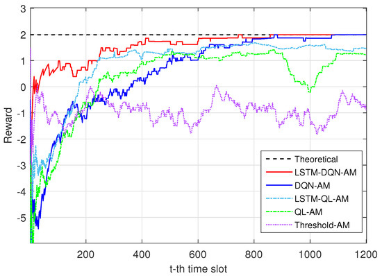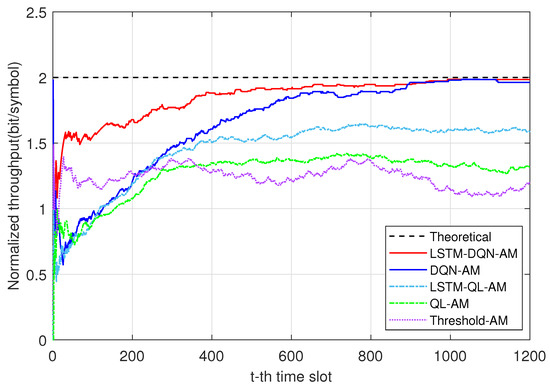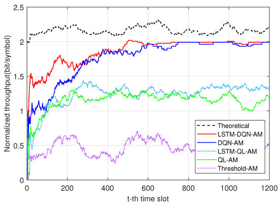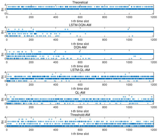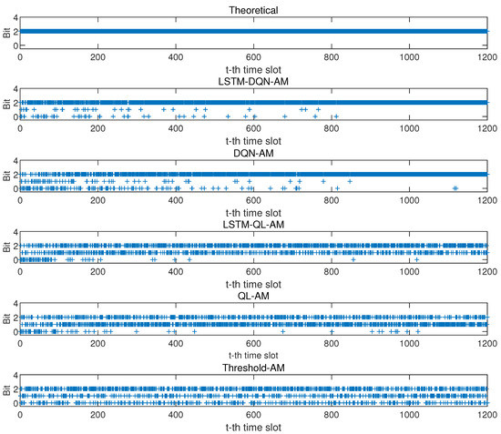 Figure 16 shows the number of successfully received bits per symbol in each time slot in the sea experiments. The learning result of LSTM-DQN-AM was the closest to the ideal scheme. Compared to the other methods, LSTM-DQN-AM had fewer failures and the more frequent selection of higher-order modulation modes under the BER constraints. After the 700-th time slot, the transmission of LSTM-DQN-AM rarely failed. LSTM-DQN-AM had an excellent learning ability to select the appropriate modulation mode that matched the channel state, so its performance was more stable than those of the other methods.