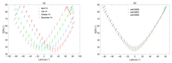 (a) Latitude distribution of SZAs on 14 April (blue ‘+’), 14 July (red ‘o’), 14 October (green ‘*’), and 14 December (purple ‘·’) in 2011; (b) latitude distribution of the SZAs for orbit 50200 (blue ‘o’), 50201 (red ‘·’), and 50202 (green ‘*’) on 5 October 2011.