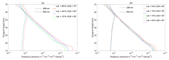 A sample of SCIAMACHY limb radiance profiles on orbit 49886 on 13 September 2011: (a) limb radiance profiles at different latitudes and corresponding SZAs in the northern hemisphere; (b) limb radiance profiles of the northern and southern hemispheres at the same latitudes and corresponding SZAs.