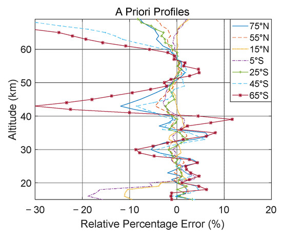 The WMART equation requires an initial ozone density profile, known as the initial estimate. It is important to understand how an initial guess affects the retrieved solution [21]. In this study, the McLinden climate ozone density profiles [40] from the SCIATRAN database were used as initial estimates. To test the a priori error in ozone retrieval, ozone profiles at different latitudes (75°N, 55°N, 35°N, 15°N, 5°S, 45°S, and 65°S) in the same month were sequentially selected as the initial guess. The ozone profiles were retrieved in the same limb scan with the other conditions remaining unchanged. It was assumed that the ozone profile retrieved by an a priori guess of 35°N was the true result, whereas all others were untrue. The differences between the correct and incorrect a priori profiles are shown in Figure S2. Relative errors are shown in Figure 3 where the greater the difference between the untrue and true a priori profiles, the greater the relative error. There were some large errors at the upper and lower boundaries and 44 km of retrieval, notably consistent with the a priori averaging kernel, because the retrieved ozone profile only changed its size but not its shape beyond the retrieval range (10–69 km). Therefore, the variation in the ozone profile generated at lower or higher altitudes depended on the shape differences between the initial estimates. When the influence of this difference disappeared, the relative error in the retrieval range was ≤3%.
