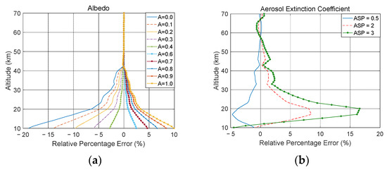 Assuming that the ‘correct’ albedo is 0.5, the albedo with a step size of 0.1 and range of (0.0, 1.0) was used to retrieve ozone profiles. The ozone retrieval errors caused by surface albedo deviations are shown in Figure 4a, where (1) the relative error increased with increasing differences between the correct and incorrect albedos; (2) the albedo deviation was positive, as was the error, and vice versa; (3) the error increased with a decrease in altitude and the influence of surface albedo was mainly in the range of 10–43 km; (4) the ozone retrieval error caused by negative albedo deviation was larger than that for positive deviation, with the maximum error at the lowest altitude being <±3%. The impact of more surface types, such as ocean, snow, grasses, and loam soil for the bidirectional reflectance distribution function (BRDF) on ozone retrieval were also investigated (Figure S3).