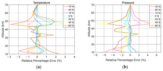 Ozone retrieval error caused by neutral density. (a) Pressure profiles at different latitudes; (b) temperature profiles at different latitudes.