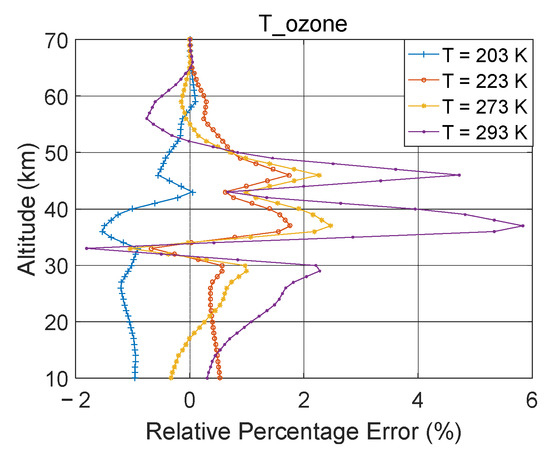 The effect of changes in air density on ozone can be assessed by changing temperature or pressure. As the ozone absorption cross-section depends only on temperature, it is suitable for investigating the influence of temperature sensitivity at the absorption cross-section on the retrieval of the ozone profile (T-ozone) [25]. The ozone absorption cross-sections of Burrows et al., at 203, 223, 243, 273, and 293 K were adopted for ozone retrieval under the same conditions. The ozone concentration retrieved from the ozone absorption cross section at 243 K was taken as the true state, whereas those from all other cross sections were taken as the perturbed results. The ozone retrieval errors caused by different ozone absorption cross sections were markedly different (Figure 6). There was a negative deviation, with a maximum of 1.8% between 223 and 243 K. The maximum error was ~6% at 293 K.