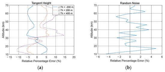 Relative percentage error. (a) Different tangent height deviations; (b) random noise.