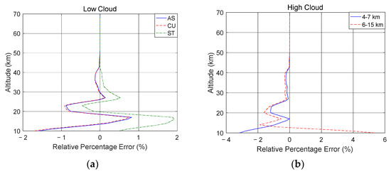 Relative errors between cloud and no cloud cover. (a) Low cloud coverage; (b) high clouds.