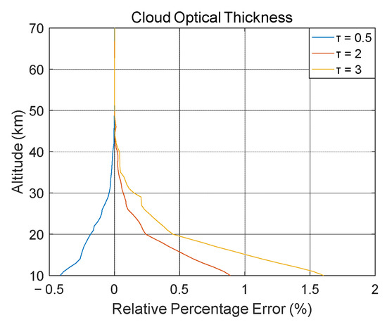 Clouds in the atmosphere play an important role related to their reflection, absorption, and transmission of solar radiation [22]. This section discusses the sensitivity of ozone retrieved from limb-scattered radiation measurements to clouds via the SCIATRAN model. The clouds considered were uniform in both vertical and horizontal directions, assuming the Mie phase functions for cloud particles, 10 as the number of cloud sublayers with a 6 µm effective radius of water clouds. Here, we considered cloud height and the optical thickness () as parameters. Because of the lack of detailed information on some characteristics of clouds observed in the earth’s atmosphere, it was impossible to qualitatively study the impact of different types of tropospheric clouds on the accuracy of the ozone vertical profile using actual measured data; a numerical simulation method was used to achieve this objective.