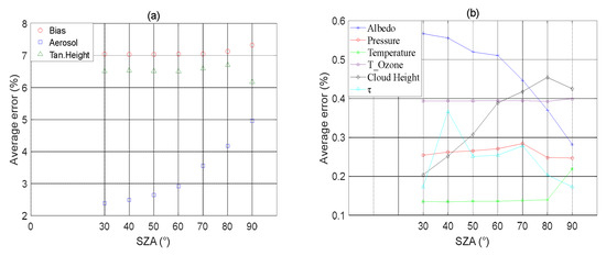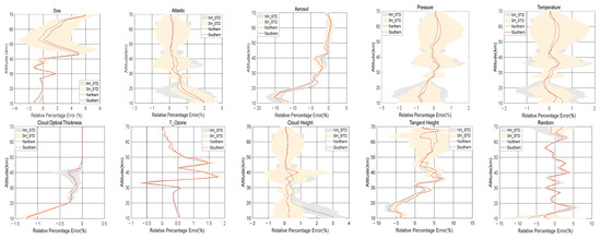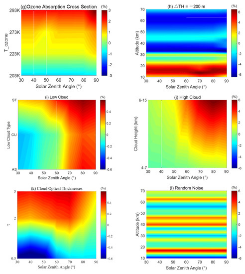In contrast to other error sources that indirectly affect the retrieval vector through the forward model, instrument noise belongs to the error in the measurement radiance that constitutes the retrieval vector. In this study, the random vector was generated from the Gaussian distribution at a mean value of 0 and standard deviation () of 0.005. We confirmed that the noise error was random, indicating the sensitivity of the retrieved ozone profile to random radiance error. Figure 7b shows the ozone retrieval error using the random error of the measurement vector calculated according to Equation (A12), where the error varied with altitude. For 18 < < 38 km, the error was <2%, whereas the error outside this area was larger. As the normalized TH was approached, the sensitivity of the algorithm to ozone weakened, increasing the sensitivity to noise. At low altitudes, the sensitivity of the algorithm to ozone was reduced.
