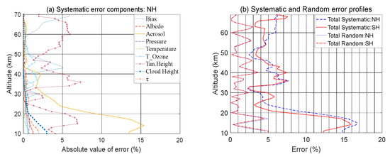Traditionally, errors are divided into systematic and random errors, based on whether the error between consecutive measurements is constant. Rodgers believed that retrieval noise belonged to random errors, whereas some model parameter errors belonged to systematic errors [39]. Notably, the differences between systematic and random errors are valuable for the verification and mutual comparison of ozone profiles across different instruments. Specifically, the total systematic error can explain bias, whereas the total random error determines precision. If the two error components are independent, the total error () can be calculated as follows: