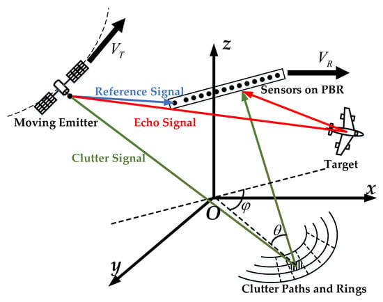 The geometric structure of the airborne PBR system considered in this paper is shown in Figure 1, in which a low-orbit satellite is used as the signal emitter. The PBR flies at altitude H and speed , the reference sensor of the radar is pointed at the moving emitter, a uniform linear array (ULA) composed of sensors is used as a set of surveillance sensors to point to the surveillance area, the distance between the array elements is , and the speed of the emission source is .