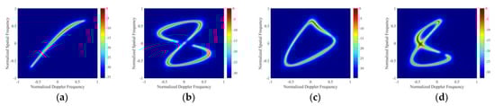 The space–time plane is uniformly discretized into grid points along the spatial angular frequency axis and the Doppler frequency axis, where , , parameters and are the corresponding meshing coefficients and . The discretized spatial frequency and Doppler frequency interval can be expressed as and . The network points formed after discretization correspond to the steering vectors in the space–time dictionary. Assuming that some clutter points are located at the grid points, the snapshot in Equation (5) can be expressed as: