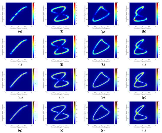 Spatial–temporal clutter spectra of: (a) OPT in relationship 1, (b) OPT in relationship 2, (c) OPT in relationship 3, (d) OPT in relationship 4, (e) Traditional STAP algorithm used in relationship 1, (f) Traditional STAP algorithm used in relationship 2, (g) Traditional STAP algorithm used in relationship 3, (h) Traditional STAP algorithm used in relationship 4, (i) Traditional SR–STAP algorithm used in relationship 1, (j) Traditional SR–STAP algorithm used in relationship 2, (k) Traditional SR–STAP algorithm used in relationship 3, (l) Traditional SR–STAP algorithm used in relationship 4, (m) BCS–STAP algorithm used in relationship 1, (n) BCS–STAP algorithm used in relationship 2, (o) BCS–STAP algorithm used in relationship 3, (p) BCS–STAP algorithm used in relationship 4, (q) PROGSBL–STAP algorithm used in relationship 1, (r) PROGSBL–STAP algorithm used in relationship 2, (s) PROGSBL–STAP algorithm used in relationship 3, (t) PROGSBL–STAP algorithm used in relationship 4.