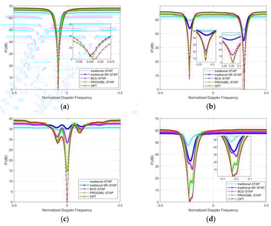 In order to further quantitatively analyze the singular samples elimination performance of the PROGSBL–STAP, this experiment simulates the relationship between the signal-to-noise ratio IF and the normalized Doppler frequency of the distance unit to be detected. The IF can be obtained using Equation (32), and the results are the average of 300 Monte Carlo experiments.