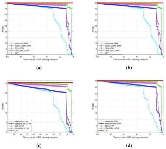 As a further quantitative analysis, in order to compare the clutter suppression performance of each algorithm with different IID training samples, this experiment calculates the relationship between the average IF value(dB) of each algorithm with the reduced number of IID training samples at the zero spatial-Doppler. Figure 4a–d shows the IF curves of relationships 1, 2, 3, and 4, respectively, and the results are the average of 300 Monte Carlo experiments. It can be seen that with the reduction of the number of IID samples, the clutter suppression performance of each algorithm is ranked from high to low as: PROGSBL–STAP, BCS–STAP, traditional SR–STAP, and traditional STAP. Especially when the number of training samples is from 10 to 3, the clutter performance of the proposed PROGSBL–STAP algorithm can still maintain an advantage over the existing algorithm, and the performance is close to OPT.