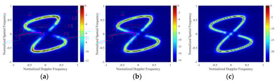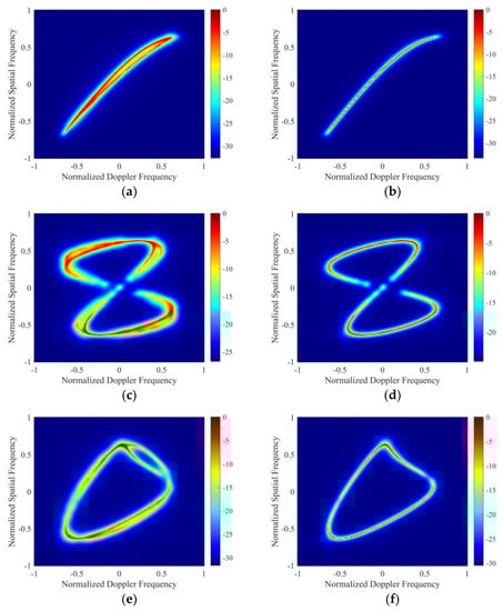 This experiment evaluates the performance of the proposed algorithm by comparing the space–time clutter spectra obtained using the proposed algorithm with three other existing algorithms (traditional STAP algorithm [17], traditional SR–STAP algorithm [22,23,24,25], and BCS–STAP algorithm [30]). The key parameters used in the simulation are shown in Table 2, in which the non-cooperative transmitting source and transmitting signal adopt parameters close to GPS, and this experiment and subsequent experiments were carried out using MATLAB2021 software. In the experiment, in order to reflect the off-grid computing performance advantage of this algorithm, the space–time dictionary of the traditional SR–STAP, BCS–STAP, and the PROGSBL–STAP algorithms in this paper is divided into the same grid grids. Furthermore, in order to reflect the adaptability of the algorithm to the bistatic PBR configuration, four typical different relative motion relationships between the transmitter and the receiver are selected for verification in this paper. Figure 2 shows the experimental results of this section.