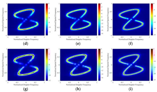 Spatial–temporal clutter spectra in relationship 1: (a) Traditional SR–STAP (grid ), (b) BCS–STAP (grid ), (c) PROGSBL–STAP (grid ), (d) traditional SR–STAP (grid ), (e) BCS–STAP (grid ), (f) OROGSBL–STAP (grid ), (g) traditional STAP (grid ), (h) BCS–STAP (grid ), (i) PROGSBL–STAP (grid ).