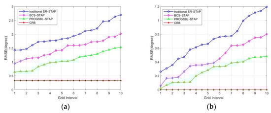 In order to further quantitatively analyze the off-grid performance of the PROGSBL–STAP, this experiment compared the three algorithms with the Cramer–Rao Bound (CRB). The performance improvement of the proposed algorithm was verified by calculating the relation between the space time estimated root mean square error (RMSE) and the grid interval. The results calculated at SNR 10 dB and 25 dB were the average of 300 Monte Carlo experiments.