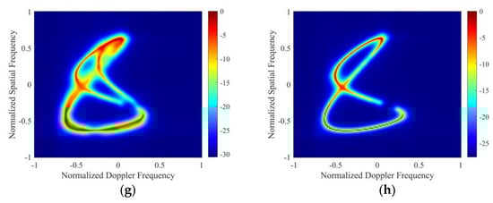 From Figure 7a–h, it can be seen that, in the space–time clutter spectrum of relationships 1, 2, 3, and 4, the estimation performance of the PROGSBL–STAP (before eliminating singular samples) is affected by singular values in Figure 7a,c,e,f, while the PROGSBL–STAP (after eliminating singular samples) can better achieve accurate clutter spectrum estimation when there are singular values in the clutter training sample in Figure 7b,d,f,h.